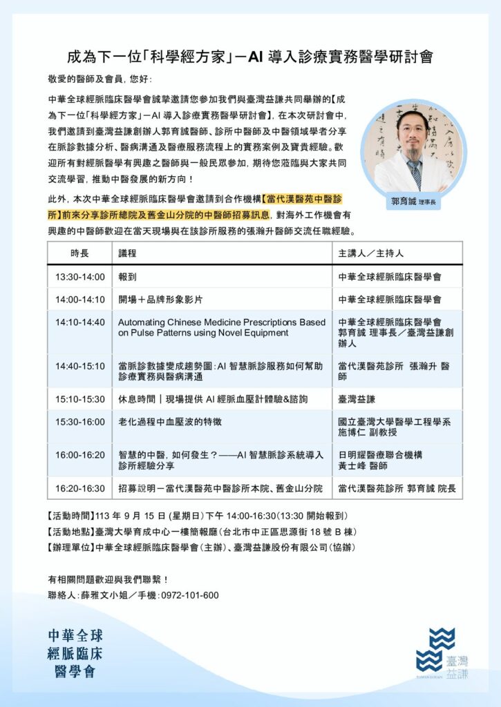【醫學研討會行前通知】09/15 本週日/成為下一位「科學經方家」-AI 導入診療實務醫學研討會